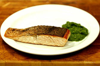 Frying skin-side-down and then baking is the perfect way of cooking salmon steaks so that the skip is crispy and the flesh cooked to perfection. In this dish, the salmon is accompanied by a salsa made from wild garlic. A delight of natural spring fare. Preparation Time: 15 Mins Cooking Time: 5 Mins Total Time: 25 Mins Ingredients For 4 servings… 2 tbs Olive oil 4 steaks Salmon - skin on Pepper Salt For the salsa 100 gms Wild garlic 6 leaves Sorrel 100 gms Parsley - flat leaved 1 tbs Capers 5 Anchovy fillets 1 tsp Mustard - Dijon 4 tbs Olive oil To serve 4 wedges Lemon Method To make the salsa verde… Put the wild garlic, sorrel and parsley a food processor or blender. Add the capers, anchovies, mustard and 1 tablespoon of the olive oil. Blend to coarsely chop, then pour in the remaining olive oil and process to a rough purée. Season to taste. Decant the sauce into a serving bowl and set aside. To cook the salmon… Heat an oven to 200°C Put the olive oil into an oven-proof frying pan and set over medium heat. Pat the salmon fillets dry with kitchen paper and season generously on the skin side. When a slight haze is wavering over the pan, add the salmon fillets - skin-side down. Season the flesh side lightly. Cook the skin side for 3 minutes without turning them - until the skin is golden and crisp. Turn over the fillets, put the frying pan into the oven and cook for two minutes. Serve the fillets with wedges of lemon and a good dollop of the salsa verde. Wine recommendations A robust white wine. Conventional Côtes du Rhône blanc Interesting Côtes du Luberon blanc Hermitage blanc Saint Joseph blanc