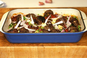 This dish comes from Palestine and is packed with spicy flavours both in the meatballs and in the sauce. It can be served as a supper dish or as a meze dish. Preparation Time: 20 Mins Cooking Time: 50 Mins Total Time: 80 Mins Ingredients For 4 servings… For the meatballs 2 slices Bread - stale white 50 ml Milk 1 Onion - chopped roughly 2 cloves Garlic - crushed 500 gms Mince - beef 2 tsp Cinnamon - ground 1 tsp Allspice - ground 15 gms Parsley - chopped 10 gms Mint - chopped roughly 1 Lemon - zest of, grated 70 gms Olives - green - pitted, chopped roughly Pepper - freshly ground, black 1¼ tsp Salt For the tomato sauce 50 ml Olive oil 1 Onion - chopped finely 4 cloves Garlic - crushed 1 tsp Cumin seeds - crushed lightly 6 pods Cardamon - bashed 1 stick Cinnamon ½ tsp Chilli flakes 2 tsp Tomato purée 8 Tomatoes - plum, chopped 250 ml Stock - chicken 2 tsp Sugar - muscovado Pepper Salt 300 gms Peas - frozen 150 gmas Feta cheese - cut into cubes To serve 2 Shallots - chopped Parsley Method To make the meatballs... Put the bread and milk into a bowl and mash together until the bread has completely disintegrated. Put the onion into a food processor and pulse a few times until very finely chopped but not liquidised. Then add the bread-milk mixture, the garlic, mince, spices, herbs, lemon zest, olives, salt and pepper. Blend just long enough to mix the ingredients. With lightly oiled hands, shape the mixture into golf ball-size balls. Put 2 tablespoons of oil into an oven-proof, large sauté pan and place on a medium heat. Add the meatballs in batches — do not overcrowd the pan — and fry them for about 3 minutes, turning so that all sides get nicely browned. Transfer the balls to a separate plate and set aside. Heat an oven to 22O°C. To make the sauce… Return the pan used to fry the meatballs to the heat and add another tablespoon of oil. Put in the onion and cook for about 6 minutes until softened and nicely browned - scraping the pan for any flavoursome bits at the bottom. Add the garlic, cumin, cardamom, cinnamon, chilli and tomato purée and cook for another minute. A dd the tomatoes, stock, sugar, salt and pepper and cook for about 20 minutes - until reduced by a third. Remove from the heat, stir in the peas. Top with the meatballs, scatter over the feta and drizzle with the remaining 1 teaspoon of oil. Place in the oven and bake for 20 minutes, or until the meatballs are cooked though, the sauce is bubbling and the feta has taken on some colour. Leave to sit for about 10 minutes and then sprinkle with the shallots and parsley. Serve. Variations The bread and milk can be replaced with grated and drained courgette. Wine recommendations A robust red wine. Conventional Côtes du Rhône Interesting Cairanne Corbières Cornas Saint Joseph