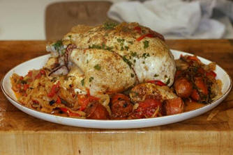 This is a lovely spicy chicken dish which reflects the Basque cooking style. It tastes is full of the Pyrenees sun shine. Preparation Time: 15 Mins Cooking Time: 1¾ Hrs Total Time: 2 Hrs Ingredients For 6 servings… 2 tbs Olive oil 2 Onions - sliced thinly 2 cloves Garlic - crushed 2 Peppers - red - cut into strips 1 tsp Chilli - Espelette - ground 1 Chicken 230 gms Chorizo - sliced across 1 sprig Parsley 1 sprig Marjoram 1 sprig Thyme 4 Tomatoes - chopped roughly 40 cl Stock - chicken Pepper - freshly ground, black Salt To serve Rice - plain boiled Method Heat the oil in a flameproof casserole and soften the onion, garlic and red pepper over a gentle heat. Stir in the Espelette chilli and cook for one minute more. Remove vegetables from the pot and keep them warm. Turn up the heat and put the chicken into the casserole with the chorizo sausage and brown all over. Return vegetables to the pot. Add the herbs and tomatoes and pour over stock. Season with salt and pepper. Cover with a lid and simmer gently for 1 hour 20 minutes Serve with plain boiled rice. Variations The Espelette chilli can be replaced with ½ tsp Cayenne. For an even more authentic flavour, the chorizo can be replaced with loukenkas – a spicy Basquais pork sausage. Wine recommendations A red or a white wine. Conventional Irouleguy Interesting Béarn Côtes de Gascogne Jurançon Txakoli