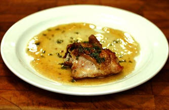 This is a simple chicken dish from France. It makes an excellent supper or lunch dish. Preparation Time: 5 Mins Cooking Time: 20 Mins Total Time: 25 Mins Ingredients For 2 servings… 2 Chicken thighs Pepper Salt 75 gms Butter 200 ml Wine - dry white 1 tbs Basil - chopped Method Season the chicken with salt and pepper, sauté it in one third of the butter until brown all over, cover the pan and continue to sauté until cooked through. Take the chicken out of the pan and reserve it on a warm dish. Deglaze the pan with the wine and add the basil. Then whisk in the remaining butter and adjust the seasoning. Pour this sauce over the chicken. Variations Other parts of a chicken other than thighs can be used, however, the cooking times may have to be altered to ensure they are cooked through. Wine recommendations A red or a white wine. Conventional Beaujolais Mâcon Interesting Côte Chalonnaise rouge or blanc Riesling