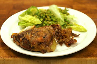 Duck confit is a classic bistrot dish. The idea is to achieve beautiful crispy skin. The flavour of duck comes over as well as any duck dish. Preparation Time: 20 Mins Cooking Time: 100 Mins Total Time: 2 Hrs Ingredients For 4 servings… For the confit 4 Duck legs 250 gms Fat - duck 4 cloves Garlic - unpeeled 5 Cloves 1 Bay leaf 10 Peppercorns - black 2 tsp Salt 1 Potato - large, cut into 4 slices For the peas 150 gms Peas Salt 1 tsp Sugar - caster 1 Orange - juice and grated rind of 1 handful Salad leaves Method Heat an oven to 180°C. To cook the confit… Pack the legs into a tight-fitting pan then add the duck fat and the rest of the ingredients - except the potato. Season well, cover the pan with a lid and cook in the oven for an hour or until the legs are soft but not falling apart. Lay the potato slices in an ovenproof pan, remove the duck legs from the fat (do not discard the fat) and place one leg on top of each slice of potato. Cook in the oven for 35 minutes until the skin is crisp. If necessary, cover the legs with foil to prevent them burning. Meanwhile, cook the peas… Put the peas into boiling salt water with the sugar and cook them for 4 minutes. To make the dressing… Put the orange peel and juice in a bowl and whisk in a tablespoon of the the liquid duck fat. To serve… Transfer the duck legs on their potato slices to serving plates. Arrange the peas and salad leaves around duck and spoon around the dressing. Wine recommendations A red wine - ideally a Burgundy. Conventional Burgundy Interesting Mercurey Regnié Special Volnay