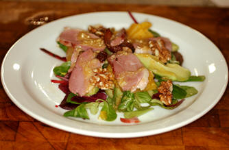 This smoked duck breast salad makes a lovely starter or light supper dish. The duck, orange, walnuts and avocado go really well together. Preparation Time: 15 Mins Cooking Time: 10 Mins Total Time: 25 Mins Ingredients For 4 servings… 1 Smoked duck breast 2 Oranges Salad leaves 1 Avocado - flesh - sliced 75 gms Walnut halves Vinaigrette - made with walnut oil Method Remove the skin from the smoked duck breast and slice the meat. Crispen the skin in a hot oven or under a grill and allow to cool. Then chop the crispy duck skin into croûtons. Meanwhile, peel, de-pith and section the oranges - reserving any juice. Arrange the salad on 4 plates with slices of duck, orange, avocado and walnuts. Drizzle over vinaigrette with any reserved orange juice and finish each salad with some crispy skin croûtons. Wine recommendations A white wine or light red. Conventional Mâcon Interesting Pinot Noir Alsace Reuilly blanc or rouge Vin de pays Charentais blanc or rouge