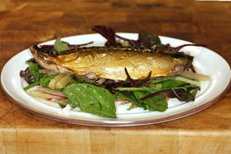 This makes a lovely salad dish – slightly unusually the smoked mackerel is heated and the skin crispened. The rhubarb couples terrifically with the mackerel. Preparation Time: 10 Mins Cooking Time: 6 Mins Total Time: 16 Mins Ingredients For 4 servings… Salt 120 gms Rhubarb - cut into matchstick-sized pieces 50 gms Ginger - root, cut into martchstick-sized pieces 4 fillets Smoked mackerel 1 handful Salad leaves Pepper For the dressing 3 tbs Olive oil 1 tbs Vinegar - cider 2 tsp Honey - runny Pepper - freshly ground, black Salt Method Heat an oven to 190°C. To cook the rhubarb… Bring a pan of salted water to the boil, then plunge in the rhubarb. Leave for 10 seconds, drain and refresh under cold water; pat dry on kitchen towel. To make the dressing… Whisk the ingredients together until amalgamated. To cook the mackerel… Put the mackerel fillets on a baking tray and then warm in the oven, skin-side up, for 6 minutes, until the skin starts to crisp. Mix together the ginger and rhubarb, the salad leaves and the dressing. Season again to taste. To serve, arrange the salad on plates, place the mackerel on top and drizzle over any remaining dressing. Variations In place of the smoked mackerel, the recipe works with fresh mackerel or other fish such as sardines. Wine recommendations A robust white wine. Conventional Côtes du Rhône blanc Interesting Côtes du Luberon blanc Riesling Adventurous Fino Sherry