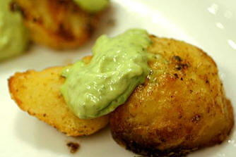 These roast potatoes have a flavour and texture that surpasses that for more traditional roast potatoes. The preparation is quite simple, particularly if the mayonnaise has already been made. It is excellent with a roast meal or fried salmon. Preparation Time: 30 Mins Cooking Time: 30 Mins Total Time: 45 Ingredients For 6 servings… 1 kg Potatoes - quartered 1 tsp Salt - flakes 1 tbs Olive oil ½ tsp Oregano ½ tsp Paprika ¼ tsp Cayenne For the mayonnaise 1 Egg - yolk Pepper - white ½ tsp Salt ½ tsp Mustard - Dijon ½ tsp Sugar 10 cl Olive oil ½ tsp Lemon juice 2 tbs Vinegar - white wine Cayenne For the wild garlic pesto 100 gms Wild garlic 2 cloves Garlic 75 ml Olive oil 2 tbs Chives 50 gms Pine nuts 50 gms Parmesan cheese For the wild garlic peston mayonnaise 3 tbs Wild garlic pesto 6 tbs Mayonnaise Method For the mayonnaise… Put the yolk into a food processor. Add the seasonings, one drop of olive oil and the lemon juice and whisk for a minute or two. This thickens the yolk and prepares it for the oil. Now add the oil 2 or 3 drops at a time. As the mixture thickens up the oil can be added a little faster. Continue until all the oil is used. If the mixture thickens too much add some vinegar. At the end taste the sauce and add some more vinegar if it is not sharp enough. For the wild garlic pesto… Put all the pesto ingredients into a food processor and blend them until they are combined. To cook the potatoes… Heat an oven to 200°C. Put the potatoes in a pan of cold salted water, bring to the boil, then simmer for 10 minutes. Drain well, tip the potatoes on to a roasting tin lined Toss them with the olive oil, oregano, spices and salt and roast them for 20 minutes – turning them from time to time. Spoon the potatoes onto a serving plate. Mix a few tablespoons of the pesto into the mayonnaise and then dollop onto the potatoes. Serve at once.
