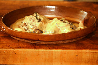 Tarragon goes extremely well with salmon. This dish is served cold and the sauce brings out the combined flavours of the tarragon and the salmon. It can be serves as a starter, as a cold main course or as a picnic dish. Preparation Time: 25 Mins Cooking Time: 3 Mins Total Time: 3 Hrs Ingredients For 4 servings… 4 steaks Salmon 140 cl Court bouillon 200 gms Mayonnaise 200 gms Yoghurt - Greek ½ Cucumber - peeled and cut into strips 1 tbs Tarragon - chopped 2 tbs Vinegar - white wine ½ tsp Salt For the court bouillon 110 cl Water 2 Onions - sliced 230 gms Carrots - chopped 2 sticks Celery - chopped 30 cl Wine - dry white 1 Bouquet garni 1 pinch Salt 6 Peppercorns - crushed For the mayonnaise 1 Egg - yolk Pepper - white ½ tsp Salt ½ tsp Mustard - Dijon ½ tsp Sugar 10 cl Olive oil ½ tsp Lemon juice 2 tbs Vinegar - tarragon Cayenne To garnish 4 strigs Tarragon To serve Salad Potatoes - new, small, soused in butter and chopped mint Method Place the salmon steaks in the warmed court bouillon and bring gently to simmering point. Let the liquid bubble for a few seconds, then remove the pan from the heat and allow the salmon and court bouillon to cool - turning the steaks every so often in the liquid until they are completely cold. Remove the salmon from the liquid and set aside on a plate. Keep the poaching liquid. Beat together the mayonnaise and yoghurt, fold in the chopped tarragon and cucumber strips and add the vinegar and about 4 tablespoons of the poaching liquid until the mixture is of a coating consistency. Season with salt. Place each steak on a plate, coat with the mixture and decorate with a sprig of tarragon. Serve with salad and scraped new potatoes soused in melted butter and chopped mint. Wine recommendations A robust white wine. Conventional Côtes du Rhône Villages blanc Interesting Riesling Vouvray sec Special Châteauneuf-du-Pape blanc Adventurous Champagne