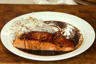 This method of cooking salmon produces and oriental-flavoured dish. It is quite quick and easy to produce. It can be served as a starter or as a main course – particularly for the summer lunch. Preparation Time: 15 Mins Cooking Time: 28 Mins Total Time: 45 Mins Ingredients For 2 servings… 2 tsp Olive oil 2 fillets Salmon For the marinade 2 tbs Honey 2 tbs Soy sauce 2½ tsp Lime juice 2 tsp Mustard - Dijon 1 tbs Water For the ginger rice 150 gms Rice - Basmati 15 gms Ginger - stem, chopped 1 tbs Sesame seeds - black and white - toasted ½ tbs Sesame oil Method Make a marinade by mixing together the honey, soy sauce, lime juice, mustard and water. Place the fish in a shallow dish and pour over the marinade. Leave for 5 minutes basting once or twice. To cook the ginger rice… Wash the rice and put into a small saucepan. Cover with water to a depth of about ½ cm and add a pinch of salt. Bring to a boil, stir, turn down the heat to low and cover with a lid. Cook for 10 minutes, turn off the heat and leave to stand for a further 10 minutes. Do not take off the lid until after the second 10 minutes. Stir in the ginger, sesame seeds and sesame oil. Keep warm. To cook the salmon… In a frying pan heat the oil over a moderate heat until hot, but not smoking, cook the salmon for 3 minutes on each side or until golden and just cooked through. Transfer the salmon to 2 plates and pour the marinade into the frying pan and simmer to reduce for 2 minutes then pour over the salmon. Serve with the gingered rice and pak choi. Wine recommendations A robust white wine Conventional Côtes du Rhône Villages blanc Interesting Mâcon Pinot Blanc Vin de pays Charentais blanc Adventurous Fino Sherry |