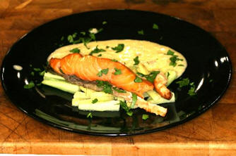 This is an exquisite and slightly unusual dish which makes an excellent starter or supper dish. Hot-smoked salmon is readily available but is best warmed up a little. If hot-smoked salmon is not available. then salmon is easily hot-smoked either is a hot smoker or on a barbeque with smoking wood chips scattered on the coals. Preparation Time: 15 Mins Cooking Time: 15 Mins Total Time: 30 Mins Ingredients For 4 servings… ¾ Cucumber ¼ root Ginger - peeled and cut into very fine juliennes 4 steaks Salmon - hot smoked Beurre blanc To garnish Parsley For the sauce 60 gms Shallots - chopped very finely 2 tbs Vinegar - white wine 4 tbs Wine - dry white 6 tbs Water 2 tbs Cream - double 170 gms Butter - cut into small pieces Pepper - freshly ground, white Salt Method Peel the cucumber and cut the flesh into very fine juliennes about 5 cm long. On 4 plates scatter the ginger and cucumber juliennes over them. Place the salmon steaks on a baking tray and warm them in an oven at 150°C for 5 minutes. Place each steak on one of the beds of juliennes, pour the sauce around the salmon and garnish with parsley. For the beurre blanc… Put the shallots, vinegar, wine and water into a pan and simmer until nearly all the liquid has evaporated. Add the cream and boil until reduced a little more. Lower the heat and gradually whisk in the butter, a few pieces at a time, until the sauce has amalgamated. Season to taste. Wine recommendations A fairly robust white wine. Conventional Côtes du Rhône blanc Interesting Côtes du Luberon Lirac blanc Riesling