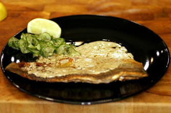 This is an exquisite dish. The tout is supported by the soured cream sauce and the cucumber is such a delicious accompaniment. Serve as a starter of as a supper dish. Preparation Time: 15 Mins Cooking Time: 10 Mins Total Time: 2¼ Hrs Ingredients For 4 servings… 4 fillets Trout Flour Pepper Salt 30 gms Butter 170 ml Soured cream Lemon juice For the cucumber 1 Cucumber - small, sliced very finely 3 tsp Salt - flaked 1 tbs Vinegar - cider 1½ tbs Sugar - caster 1 tbs Dill - chopped Pepper - freshly ground, black Method To make the cucumber relish – do this first… Layer the cucumber slices in a colander with the salt, place a weighted plate on top and set on a draining-board for a couple of hours, so the juices can run out. Rinse the cucumber and then pat it dry with a tea towel. Mix the cucumber with the rest of the ingredients and keep it, covered, until ready to serve. To cook the trout… Dip the trout fillets in seasoned flour to coat both sides lightly. Shake off any excess. Melt the butter in a large frying-pan until foaming. Cook the fish on both sides - turning over once the first side is light gold. Remove from the pan and keep warm. Add the sour cream to the pan and turn the heat down so that it heats through —the cream must not boil. Add lemon juice, salt and pepper to taste. Serve each fillet with the cucumber alongside. Spoon the sour-cream sauce over the trout and serve immediately. Wine recommendations A robust white wine. Conventional Côtes du Rhône blanc Interesting Côtes du Luberon blanc Riesling Saint Joseph blanc Special Meursault