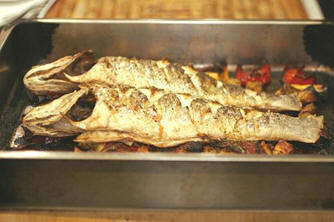 This baked sea bass is a simple, sun-soaked dish that brings together classic Mediterranean flavours in one dish. Roasted red peppers and tomatoes melt into the tender potatoes, while anchovies quietly dissolve, adding depth and savouriness without overpowering the bass. Cooked in the oven, the sea bass emerges moist and delicate, absorbing the fragrant juices around it—an unfussy yet elegant recipe that feels both comforting and special. It can be served as a main course or as a starter. Preparation Time: 20 Mins Cooking Time: 50 Mins Total Time: 70 Mins Ingredients For 2 servings… 1 pinch Saffron strands 450 gms Potatoes - cut into 1 cm slices Salt 2 Tomatoes - plum, quartered lengthways 30 gms Anchovy fillets 70 ml Stock - chicken 2 Peppers - red - cut into 8 4 cloves Garlic - sliced into 3 slices 4 sprigs Oregano 40 ml Olive oil Pepper - freshly ground, black 1 Sea bass Method Heat an oven to 200°C Place the saffron in a cup, pour over 2 tablespoons of hot water and leave to soak. Put the potatoes in a pan of boiling salted water and par-boil for 7 minutes. Drain well and arrange them in a narrow strip over the base of a roasting dish large enough to hold the sea bass. The potatoes should form a bed for the fish - leaving plenty of room on either side for the red peppers. Scatter the tomatoes and anchovy fillets over the potatoes and then pour over the saffron water and stock. Scatter the pieces of red pepper down either side of the potatoes and sprinkle over the garlic, oregano sprigs and olive oil. Season everything well and bake in the oven for 20 minutes. Cut the fish 5 times down each side and then cut it in the opposite direction on just one side to give a criss-cross pattern. Rub it generously with some olive oil, season well and then rest it on top of the potatoes. Return the dish to the oven and bake for a further 20 minutes, until the fish is cooked through. Serve with the roasted vegetables. Wine recommendations A white wine. Conventional Picpoul de Pinet Interesting Chablis Jurançon sec