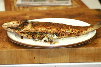 Sea bass is a name for a variety of fish species prized for their mild flavour, firm texture, and culinary versatility. There are many ways of cooking sea bass – frying, grilling, steaming, etc. They can be served whole, as fillets or as steaks. In this recipe it is baked whole. Again, there is a plethora of options for how the fish is prepared but in this recipe the flavour of the fish is enhanced with an herb-based stuffing. It is an excellent dinner party or supper dish. Preparation Time: 10 Mins Cooking Time: 30 Mins Total Time: 40 Mins Ingredients For 4 servings… 1 Sea bass 3 tbs Olive oil 1 Leek - small, white part 2 cloves Garlic - chopped 30 gms Almonds - toasted, chopped 1 tbs Parsley - chopped 1 tbs Tarragon - chopped 1 Lemon - grated rind and juice of 1 glass Wine - dry white Pepper - freshly ground, black Salt 1 ox Breadcrumbs - dried Method Heat an oven to 200°C. Place the fish in an oiled baking dish. Combine the leek, garlic, almonds, parsley and tarragon and stuff the cavity of the fish with this mixture. Brush the fish with the remaining olive oil and pour over the lemon juice and white wine. Sprinkle with the lemon rind and season well. Then sprinkle over the breadcrumbs. Bake in the oven for 30 minutes - basting with the oil and juices halfway through the cooking time. Wine recommendations A robust white wine. Conventional Chablis Interesting Muscadet Sèvre et Maine Sur lie Savennières Silvaner Special Meursault Savigny-Lès-Beaune blanc