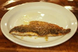 This is a very quick way of cooking sea bass but one which has lovely subtle flavours. These are provided by the coriander, ginger, garlic and lime in the butter. The butter is used to cook the fish. Preparation Time: 10 Mins Cooking Time: 3 Mins Total Time: 15 Mins Ingredients For 2 servings… 1 tbs Olive oil 2 fillets Sea bass For the butter 100 gms Butter 1 small bunch Coriander - chopped 2˝ cm Ginger - root, grated 2 cloves Garlic - crushed ˝ Lime - juice of 6 drops Tabasco To serve Lime - wedges Method To make the butter… Put all the butter ingredients in a food processor and process until a smooth, vibrant green butter is achieved. Form it into a sausage wrapped in cling film and freeze - or use it straight away. To cook the fish… Make a frying pan with a drizzle of olive oil hot on a hob. Fry the fish skin side down for two minutes so it turns golden. Then turn the heat down a little, flip over the fillets and add 2 tbsp of the butter to the pan and swirl it around. Cook the fish for a minute in the butter - basting the fillets with the butter. Serve with wedges of lime. Variations The recipe works very well with other white fish such as cod, haddock and mullet. Wine recommendations A gentle white. Conventional Picpoul de Pinet Interesting Entre-deux-Mers Riesling