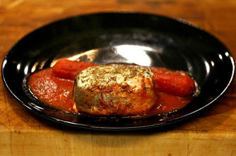 Hake steaks always have more flavour than fillets. Now, wrap them in paper with some well-prepared tomatoes and some basil, bake them in an oven and the result is stunning. They make a starter of, what should turn out to be, a magnificent dinner. Preparation Time: 10 Mins Cooking Time: 25 Mins Total Time: 35 Mins Ingredients For 4 servings… Olive oil 2 tbs Basil leaves - shredded 4 steaks Hake Pepper - freshly ground, black Salt For the tomatoes 1 tin Tomatoes - plum ½ tsp Salt - flakes 1 tsp Thyme - leaves Pepper - freshly ground, black To serve 4 tbs Tapenade Method To prepare the tomatoes… Cut the tomatoes in half and place them cut- side up in a lightly oiled pan. Sprinkle over the salt, thyme leaves and some pepper and heat for 10 minutes. Leave to cool. To cook the fish… Heat an oven 240°C. Prepare four squares of cooking parchment and oil them well with olive oil. Put 3 pieces of tomato slightly off-centre on each square and sprinkle with basil. Season the pieces of hake on both sides with salt and pepper and put them on top of the tomatoes. Fold and seal the parcels, place them on a baking sheet and bake for 15 minutes. Serve the papillotes on a large plate and slit them open at the table so that everyone can enjoy the aroma. Place the contents on to 4 warmed plates and spoon around some tapenade. Variations This recipe can be used to cook cod, haddock, sea base, turbot or halibut. Wine recommendations A dry white wine, Conventional Chablis Interesting Côte Chalonnaise blanc Jurançon sec Special Chablis 1er cru Savigny-Lès-Beaune blanc