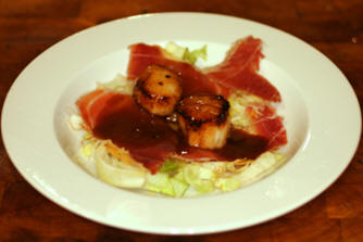 Ham and scallops make a perfect pair – particularly when the ham is serrano ham or similar. This simple dish makes an excellent starter or tapas dish. Preparation Time: 10 Mins Cooking Time: 10 Mins Total Time: 20 Mins Ingredients For 4 servings… 8 thin slices Serrano ham 1 Lettuce - heart 1 handful Salad leaves - bitter 60 gms Butter 12 Scallops Pepper - freshly ground, black Salt 3 tbs Vinegar - Sherry 1 tbs Parsley - chopped Method Arrange the ham and a pile of salad and lettuce leaves on 4 plates. Generously rub the base of a large frying pan with the block of butter and cut the remainder into small pieces. Place the pan over a high heat and, as soon as the butter starts to smoke, add the scallops and sear for 2 minutes on each side. Season them with a little salt and pepper as they cook. Arrange the scallops on top of the ham. For the sauce, remove the pan from the heat, add the sherry vinegar and scrape up any bits from the bottom of the pan. Return the pan to the heat and whisk in the small pieces of butter, a few pieces at a time. Then add the parsley and season. Spoon this sauce over the leaves and scallops. Serve at once. Variations As an alternative to serrano ham use Parma ham or Bayonne ham. Wine recommendations An aromatic white wine or dry Sherry. Conventional Manzanilla Sherry Muscadet Sèvre et Maine Sur lie Interesting Côtes de Gascogne blanc Pinot Gris Touraine sauvignon Txakoli de Getaria