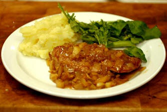Containing only the pheasant breasts, it is easy to serve and eat. The legs, wings and carcass can be used for other dishes and soup. Preparation Time: 15 Mins Cooking Time: 45 Mins Total Time: 1 Hr Ingredients For 6 servings… 60 gms Butter 2 tbs Olive oil 6 Pheasant breasts 3 Onions - sliced thinly 1 clove Garlic - chopped finely 2½ cm Ginger - chopped finely 3 Apples - eating - peeled, cored and diced 1 tbs Flour 10 cl Stock - chicken or game 30 cl Cider - dry Pepper Salt To serve Mashed potato - with parsley and chives Green vegetable Method Melt the butter and heat the oil together in a wide frying pan. Brown the pheasant breasts on each side and put them, once browned, into a warmed ovenproof casserole. Add the sliced onions, garlic and ginger to the frying pan and cook over a moderate heat, until the onions are transparent looking. Add the chopped apples and flour and stir in, cooking for a minute before pouring in the stock and cider, stirring continuously till the mixture bubbles. Season with salt and pepper and pour over the pheasant breasts in the ovenproof casserole. Cover and cook in a moderately hot oven (180°C), for 30 minutes. Serve with creamy mashed potatoes (even better with plenty of chopped parsley and chives beaten into them) and a green vegetable. Wine recommendations A cabinet franc red wine.. Conventional Saumur-Champigny Interesting Bordeaux Supérieur Bourgueil Chinon Gamay de Loire Irouleguy