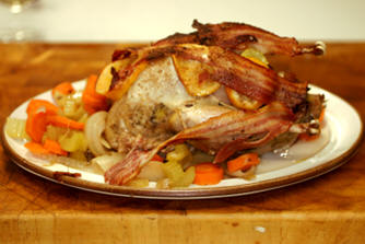 This is a simple recipe for pheasant. Nonetheless it is quite delicious. Preparation Time: 15 Mins Cooking Time: 65 Mins Total Time: 80 Mins Ingredients For 3 servings… ½ Lemon - sliced 3 rashers Bacon - streaky, smoked 1 Pheasant 1 Onion - quartered 6 Cloves 1 Bay leaf Pepper Salt 10 cl Wine - dry white 10 cl Stock 4 Carrots - sliced 4 sticks Celery - sliced 2 tbs Cornflour Method Place the lemon and bacon on the breast of the pheasant and secure with string. Put the pheasant in a flameproof casserole only a little larger than the bird and add the onion, cloves, bay leaf, seasonings, wine and stock. Bring up to the boil, cover and cook in a moderate oven at 180°C for 30 minutes. Baste the pheasant and add the carrots and celery. Replace the lid and return to the oven for a further 30 minutes. Discard the onion, cloves and bay leaf, place the pheasant on a serving dish surrounded with the carrots and celery and keep warm. Thicken the juices with cornflour blended in a little cold water and bring back to the boil. Adjust seasonings and serve the sauce with the pheasant. Variations The recipe can be employed to cook partridges. Wine recommendations A Bordeaux-style wine. Conventional Claret Interesting Bourgueil Chinon Côtes de Bourg Irouleguy Saumur-Champigny
