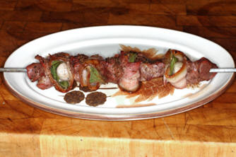 These venison kebabs, add more flavour than just grilling the venison. This flavour comes from the bacon, shallot and sage. They can be barbequed or grilled. Preparation Time: 15 Mins Cooking Time: 12 Mins Total Time: 30 Mins Ingredients For 4 servings… 300 gms Venison - cut into 3 cm cubes 8 rashers Bacon - smoked, about 10 cm long 4 Shallots - halved 8 Sage leaves 1 tbs Olive oil Pepper - freshly ground, black Salt Method Thread a piece of meat on to the end of a skewer. Then poke the skewer through the middle of a rasher of streaky bacon. Add a piece of shallot and a sage leaf, then flip the rasher of bacon around the shallot and sage and thread the two ends of it on to the skewer. The shallot and sage is then wrapped in the bacon. Add another piece of meat, then another bacon – shallot – sage parcel and continue until the skewer is full. Repeat with the remaining skewers. Drizzle a little olive oil all over the kebabs and season with salt and freshly ground black pepper. Heat a grill or light a barbeque. When the grill or barbeque is hot cook the kebabs for 12 minutes - turning regularly until the bacon is cooked and lightly charred and the venison is still just a tiny bit pink through the middle. Serve immediately. Wine recommendations A sturdy red wine. Conventional Côtes du Rhône Interesting Gigondas Vacqueyras Special Châteauneuf-du-Pape Côte Rôtie