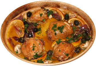This simple, but delicious, dish from Greece, makes a lovely lunchtime meal. Serve with a green salad and crusty bread. Preparation Time: 10 Mins Cooking Time: 1 Hr Total Time: 70 Mins Ingredients For 4 servings… 6 tbs Olive oil 8 Chicken thighs - bones in, skin on 1 head Garlic - broken into individual cloves 2 Onions - red, cut into wedges 2 Lemons - cut into wedges 250 ml Wine - dry white Salt 150 gms Olives - green To garnish Parsley Method Pre-heat an oven to 180°C. Drizzle a layer of olive oil onto the bottom of a roasting dish, rub the chicken in the oil and then arrange skin side up. Scatter the garlic, onion and lemon wedges in around the chicken. Pour on the wine - swirling the tin to mix. Season with salt. Cook for 45 minutes, then add the olives and cook for a further 10 minutes or until the chicken skin is crispy and the juices run clear. Transfer the chicken to a warm platter, place the roasting tin over a low heat and simmer the juices for 5 minutes to reduce a little. Pour over the chicken, garnish with plenty of fresh parsley. Serve. Wine recommendations Red, white or rosé wines go with this dish – but keep them light. Conventional Pinot Gris Interesting Côtes de Gascogne blanc, rosé or rouge Provence rosé Reuilly blanc or rouge Adventurous Manzanilla Sherry