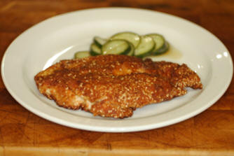 This recipe represents an exquisite way of cooking chicken breasts. They come out quite succulent and taste delicious. The cucumber “relish” is an excellent accompaniment. Preparation Time: 10 Mins Cooking Time: 8 Mins Total Time: 20 Mins Ingredients For 2 servings… For the chicken 2 breasts Chicken 60 gms Flour 1 tsp Paprika - smoked 1 tsp Salt 2 Eggs - beaten 60 gms Breadcrumbs - dried 1 tbs Sesame seeds For frying 2 tbs Olive oil For the cucumber 1 tbs Sesame oil 1 tsp Honey - runny 1 Lime - juice of 1 tsp Chilli sauce ¼ tsp Salt ½ Cucumber - cut into wedges Method Put a chicken breast between two pieces of cling film or greaseproof and beat it until it is about 2½ cms thick. Repeat with the second chicken breast. Take two large plates and a wide bowl. On one plate mix the flour with the paprika and salt. Put the beaten eggs in the bowl. On the final plate mix the crumbs and sesame seeds. Cover the chicken breasts in flour, then egg and then the crumbs mixture. Press the crumbs firmly on to the chicken. Put a large frying pan on a medium heat with plenty of oil. Fry the chicken breasts for about four minutes on each side. Do not move them around in the pan - just leave to go golden and crisp up. When the chicken is cooked, transfer it to a plate and sprinkle with flaky salt. While the chicken is cooking, make the spicy cucumber. Put the dressing ingredients in a bowl and whisk. Add the cucumber and toss it in the liquid. Serve the hot chicken with the cold, spicy cucumber. Wine recommendations A white or red wine. Conventional Beaujolais Villages Mâcon Interesting Côtes du Luberon blanc or rouge Côtes du Rhône Riesling Vouvray