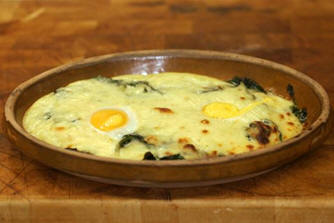 The cheese in this dish complements the spinach superbly. It makes an excellent supper dish. Preparation Time: 10 Mins Cooking Time: 35 Mins Total Time: 65 Mins Ingredients For 2 servings… Spinach 30 gms Butter Salt 1 pinch Nutmeg 1 tbs Gruyère cheese - grated 4 Eggs 2 tbs Mornay sauce For the Mornay sauce 250 ml Béchamel sauce - beaten 35 gms Gruyère cheese - grated 1 Egg yolk ½ tbs Milk 2 tbs Cream - double For the Béchamel base of the Mornay sauce 250 ml Milk 1 Bay leaf 1 slice Onion 1 blade Mace 15 gms Butter 15 gms Flour Pepper Salt Nutmeg - grated Method Heat an oven to 200°C. Wash the spinach, sprinkle with salt and stew with the butter. Drain and mix in the nutmeg. Garnish the bottom of a gratin dish with it and sprinkle on the Gruyère cheese. Break the eggs on the garnish. Cover with two tablespoons of Mornay sauce. Cook in the oven for 7 minutes or until the eggs are set. Serve. To make the Mornay source… Prepare a Béchamel sauce… Gently heat the milk with the bay leaf, onion and mace. Remove from the heat just as the milk boils, cover the pan and set aside for at least 30 minutes. Strain the milk and discard the flavouring ingredients. Melt the butter over a low heat in a heavy based saucepan. Add the flour and stir briskly until the mixture is smoothly blended, without allowing it to change colour. Gradually stir in the milk and bring to the boil, beating well to prevent any lumps forming. Season with salt and pepper and (according to the use for which the sauce is destined) a little grated nutmeg. Simmer the sauce gently for 3-5 minutes, stirring from time to time. To make the Mornay sauce… To the Béchamel sauce add the Gruyère cheese and stir until all the cheese has melted. Take the sauce from the heat and add the egg yolks beaten with the milk. Bring slowly to the boil, whisking all the time. Remove from the heat and add the cream. Wine recommendations A robust white wine. Conventional Côtes du Rhône blanc Interesting Côte Chalonnaise blanc Côtes du Luberon blanc Riesling