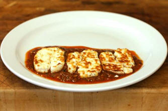 This halloumi dish is served with a spicy, intensely-flavoured Middle Eastern sauce. The cheese can be grilled or barbequed – or even fried. The dish can be served as a tapas or meze dish or as a starter. Preparation Time: 10 Mins Cooking Time: 4 Mins Total Time: 15 Mins Ingredients For 4 servings… 250 gms Halloumi - cut into ½ cm slices 1 tbs Olive oil Red zhoug For the red zhoug 100 gms Peppers - red - cooked 1 Chilli - red - chopped 1 clove Garlic 1 bunch Coriander - chopped ¼ tsp Cumin - ground 1 tbs Pomegranate molasses Method Heat a grill or get a barbeque hot. Brush the halloumi with olive oil and grill the pieces for 1-2 minutes on each side until charred. Serve immediately with the zhoug. To make the red zhoug… Put all the ingredients in a food processor and blend until smooth. Spoon onto a serving dish or individual plates. Wine recommendations A robust red or white wine. Conventional Côtes du Rhône rouge or blanc Interesting Corbières Côtes du Luberon rouge or blanc Gaillac Adventurous Fino Sherry