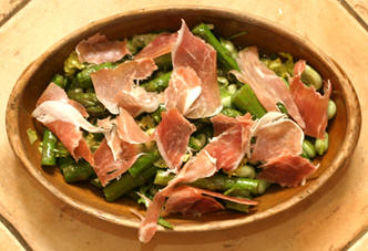 Asparagus, broad bean and cured ham salad is a lovely salad for the spring, combining the glories of asparagus and broad beans. The lavender honey gives a delightful fragrant taste. It can be eaten on its own, to accompany cold meat or as a tapas dish. Preparation Time: 20 Mins Cooking Time: 10 Mins Total Time: 30 Mins Ingredients For 6 portions 200 gms Asparagus 250 gms Broad beans - shelled 1 tbs Chervil - fresh - chopped 8 slices Ham - air-dried - Pama, Bayonne or Serrano - taorn into shreds 100 gms Salad leaves ½ tsp Salt For the vinaigrette 1 tsp Honey - lavanderer 4½ tbs Olive oil Pepper Salt 1 tbs Vinegar - white wine Method To make the vinaigrette… Put the vinegar and honey in a pan and warm to dissolve the honey. Add the salt and pepper and whisk in the oil. To prepare the salad… Bring a saucepan of salted water to the boil and cook the broad beans for two minutes then plunge them into cold water. Trim the asparagus and cook until al dente - about six minutes. If the asparagus is long, cut it into lengths about the size of French beans. Put the vegetables in a bowl with the salad leaves and the chervil and gently toss with most of the vinaigrette. Divide between four or six plates, adding the shreds of ham, and finish with the remainder of the vinaigrette. Wine recommendations Conventional Côtes de Gascogne blanc Interesting Mâcon Pinot Gris Vin de pays Charentais blanc Adventurous Manzanilla Sherry
